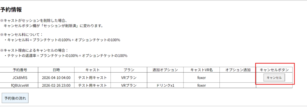 ユーザーページから、予約情報のキャンセルしたいセッションのキャンセルボタンを押してキャンセルができます。(画像を参照)