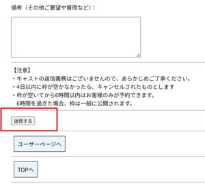 ※キャストはお伺いに必ず対応する義務はございませんので、時間が合わなかったんだなとお受け取りください。キャストへ個別の連絡をするのはご遠慮ください。