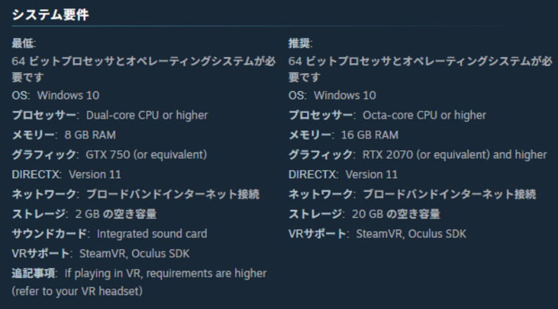 A.弊社が契約しサービスに利用しているResoniteのシステム要件は以下の通りです